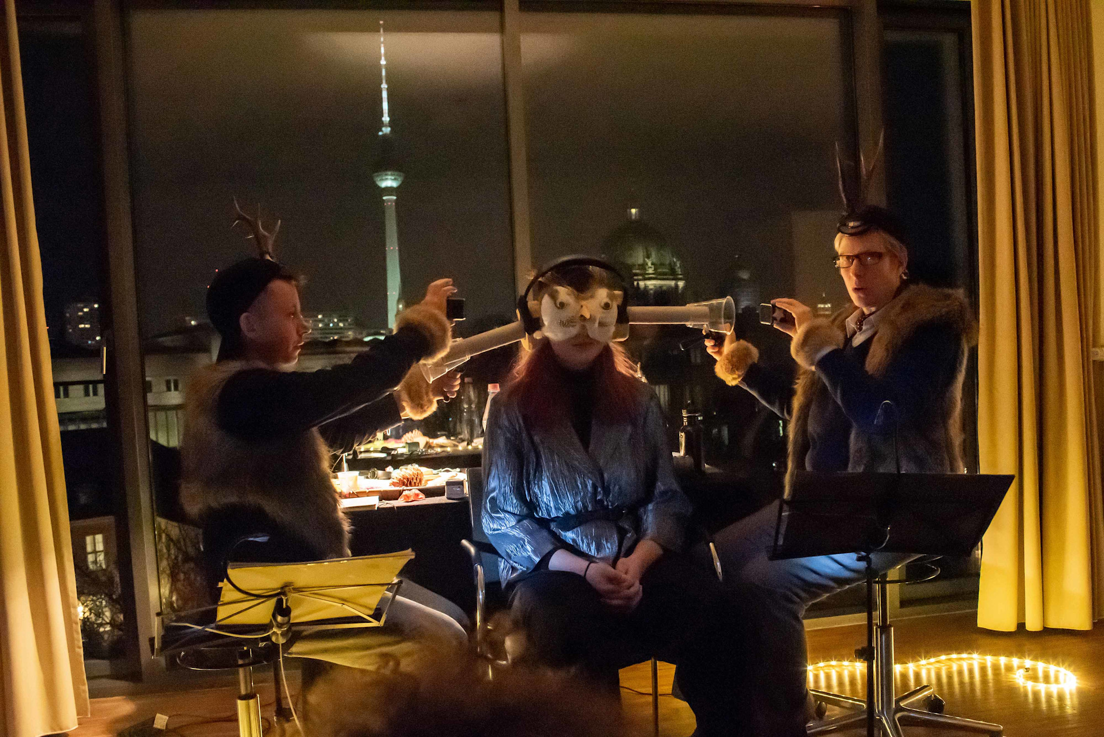 Tentaculus Ohri is a concert for one listener and two performers. Henry Wilde and Neo Hülcker will present their collection of animals of an “other nature” to you. You will wear a hearing apparatus that Hülcker and Wilde built for focused listening and you will listen to animal sounds from their archive. It will be very silent and you will learn how to listen like a blättrige Langschwanzanglerin. People will watch you and you will be a little owl. It is completely unplugged and somewhat bricolage: an assemblage of cardboard, hand-held miniature speakers and cheap objects will be played by the performers’ four hands. A small audience can watch.