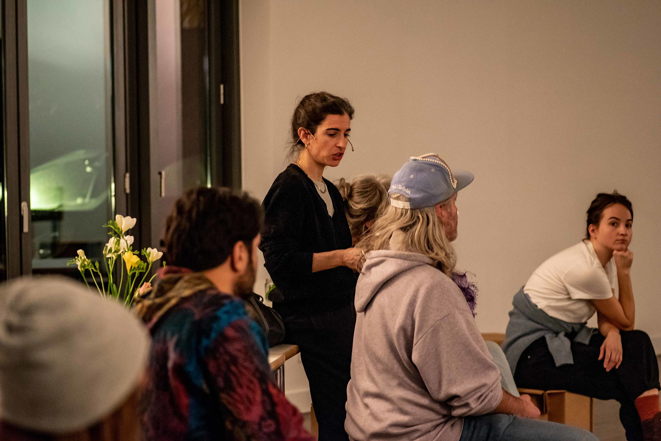 In this durational performance and installation, Janine Eisenächer investigates the practice of listening – to herself, to the things that surround her, to the Earth and to the world – as a mode of “inter-are” (S. Voegelin) and “being-with”(D. Haraway) the world and, consequently, as a method of dealing with the challenges connected to climate change. Wandering between her personally felt mental climates of rage, hope and sadness, she engages in real encounters with the things that are present in the space, paying attention to their specific material qualities, stories, and resistances. Eisenächer explores the possibilities and conditions of co-existence and co-creation by playfully creating acoustic “string figures” (D. Haraway) in a care-taking, sometimes conflicting manner. These entanglements, which make every process in life a form of co-mmunication, co-llaboration and co-mmunity, are part of us, of how we relate, of our movements and (inter-)actions, of our perceptions and experiences, of our bodies and minds, and of our world(s).